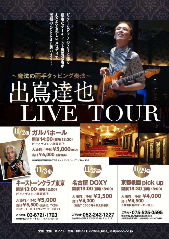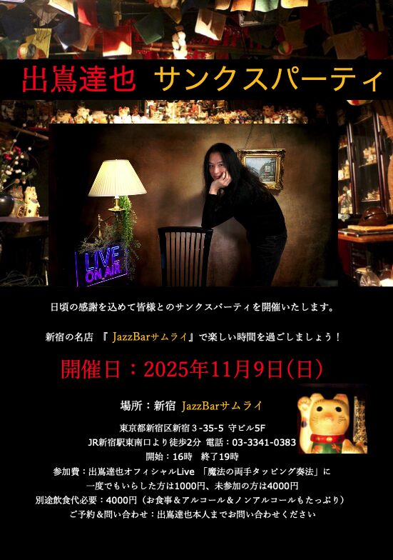 ps;11月9日のサンクスパーティはの参加費は一般4,000円ですが、これまで一度でも出嶌のライブに参加された方なら1,000円です。別途飲食代は4,000円が必要です(過去ライブ参加者は合計5000円、未参加者は8000円で食事もアルコールもノンアルもたっぷり)演奏はなくトークと懇談が主のパーティです。楽しくおしゃべりしましょう!ご予約はお早めに出嶌もしくはお店まで!(先着30名様)
