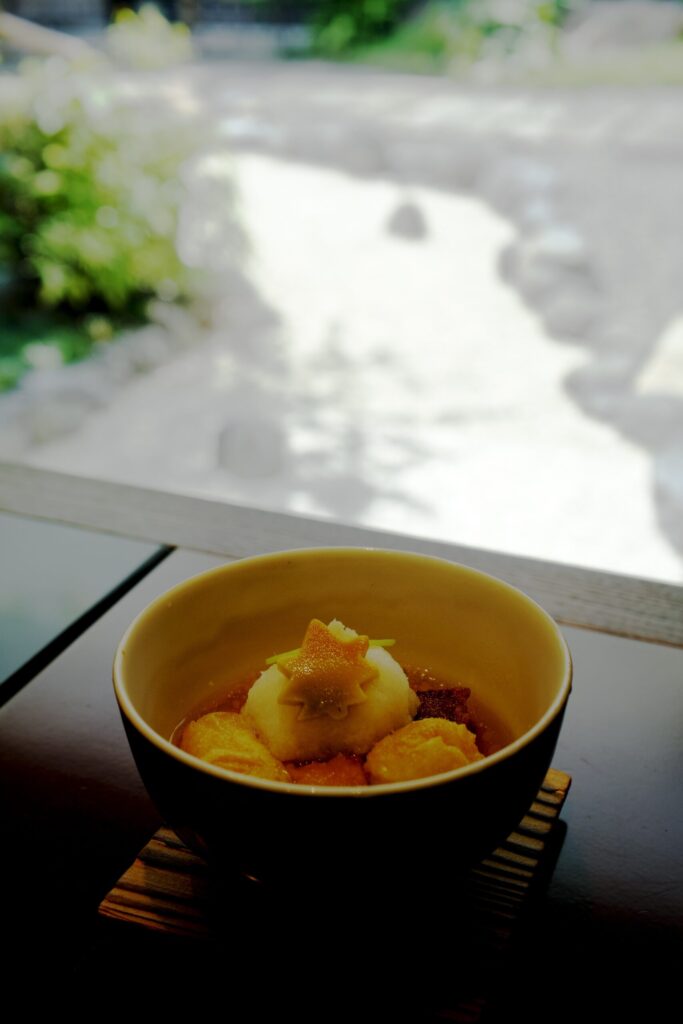 I went out yesterday and had a course meal using namafu (wheat gluten) and yuba (tofu skin). The third photo is a “Kagai Yosei” (beware of fire) charm from Atago Shrine, which is often seen in kitchens in Kyoto.