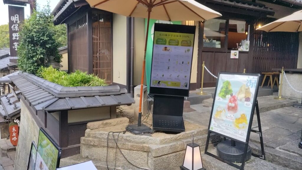 This is Sanneizaka from 27 years ago, the weeping cherry tree at Akebonotei before the owner changed, and the current Sanneizaka and sweets sign that was placed where the cherry tree was after it fell. It made me a little sad to see that such a beloved cherry tree had not been mourned in any way.